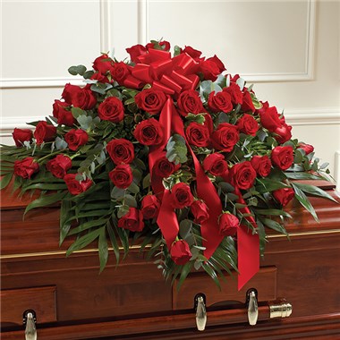 When someone near and dear to us passes, it’s natural to want to express all the love and admiration we have in our hearts. Nothing conveys this better than a classic display of red roses. Our half casket cover, crafted with care and artistry by our expert florists with over 50 premium red roses, fresh greenery, and accented with a red satin ribbon, is an unforgettable way to commemorate a lifetime of esteem and adoration. •Half casket cover arrangement of red roses and fresh greenery; accented with a red satin ribbon •Arrangement measures approximately 16"H x 38"L x 28"D •Traditionally sent by the immediate family to the funeral home •Our florists use only the freshest flowers available, so colors and varieties may vary