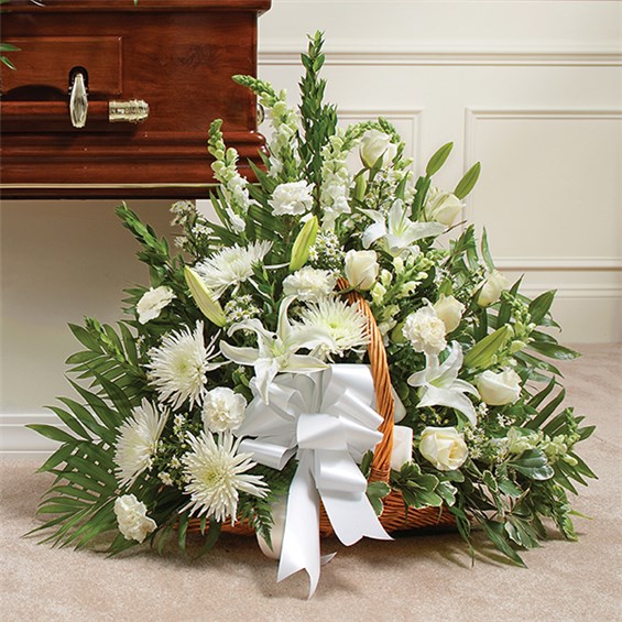 A pure heart. A peaceful spirit. A life so beautifully lived. Our fireside basket arrangement, hand-designed by expert florists with a splay of pristine white roses, captures this thoughtful sentiment in a grand display, beautifully suited for the funeral or gravesite. 28”H x 28”L